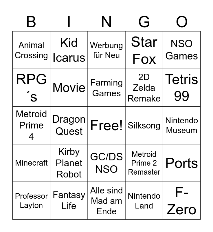 This bingo card has a free space and 24 words: Kirby Planet Robot, Fantasy Life, Farming Games, Professor Layton, NSO Games, Animal Crossing, RPG´s, Kid Icarus, Silksong, GC/DS NSO, 2D Zelda Remake, Metroid Prime 4, Metroid Prime 2 Remaster, Ports, Movie, Nintendo Land, Nintendo Museum, Werbung für Neu, Tetris 99, Dragon Quest, F-Zero, Minecraft, Star Fox and Alle sind Mad am Ende.
