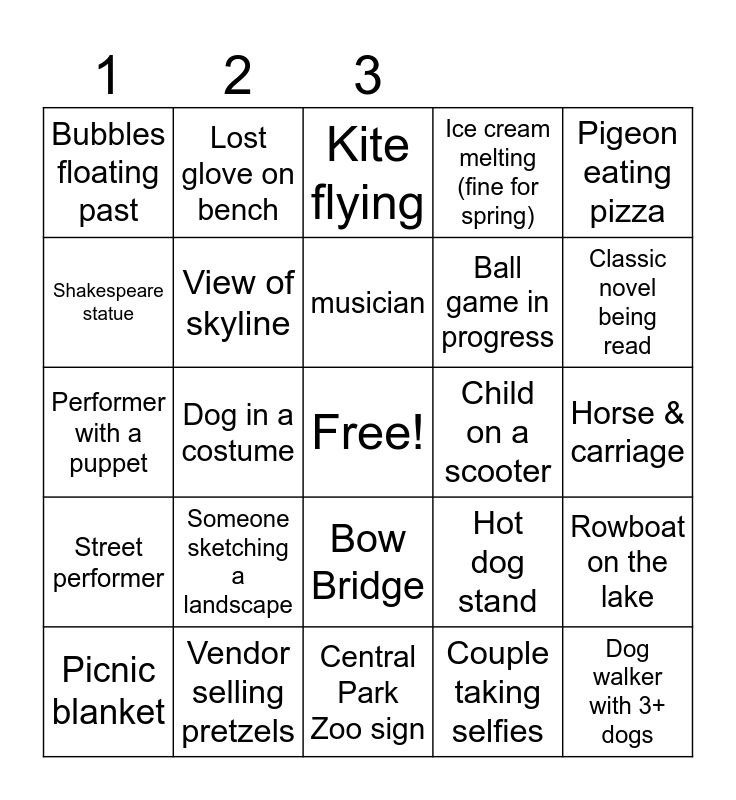 This bingo card has a free space and 43 words: Rollerblader, Dog walker with 3+ dogs, Rowboat collision, Picnic blanket, Lost tourist, Couple taking selfies, Kite flying, Actor or model photoshoot, Pigeon eating pizza, Vendor selling pretzels, Ice cream melting (fine for spring), Child on a scooter, Bow Bridge, Someone sketching a landscape, Chess players, Central Park Zoo sign, Street artist selling paintings, Performer with a puppet, The Ramble sign, Classic novel being read, Lost glove on bench, Family on bikes, Wedding, Bubbles floating past, Pigeons, Horse & carriage, Someone jogging, Bethesda Fountain, Hot dog stand, Street performer, Cherry blossoms, Rowboat on the lake, Bubble artist, Dog in a costume, Tourists with a map, The Mall (tree-lined path), Turtle in the pond, musician, Shakespeare statue, Ball game in progress, Someone painting, View of skyline and Ice cream truck.