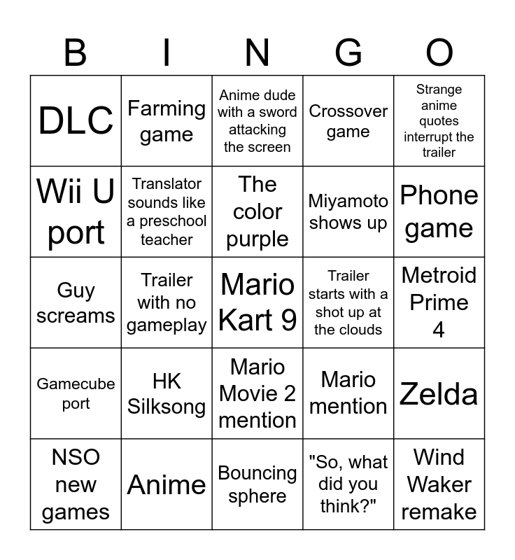 This bingo card has a free space and 27 words: Mario mention, Big tree, Miyamoto shows up, Bouncing sphere, Wii U port, Anime dude with a sword attacking the screen, Farming game, Gamecube port, Trailer starts with a shot up at the clouds, Zelda, Guy screams, Crossover game, NSO new games, Anime, Phone game, "Please take a look", Translator sounds like a preschool teacher, The color purple, HK Silksong, DLC, Metroid Prime 4, "So, what did you think?", Trailer with no gameplay, Wind Waker remake, Mario Movie 2 mention, Strange anime quotes interrupt the trailer and Mouse functionality.