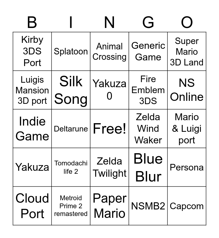 This bingo card has a free space and 24 words: Tomodachi life 2, Metroid Prime 2 remastered, Yakuza 0, Cloud Port, Super Mario 3D Land, Kirby 3DS Port, Luigis Mansion 3D port, Splatoon, Zelda Wind Waker, Zelda Twilight, Fire Emblem 3DS, Indie Game, Blue Blur, Persona, Silk Song, NSMB2, Mario & Luigi port, Animal Crossing, NS Online, Deltarune, Capcom, Yakuza, Generic Game and Paper Mario.