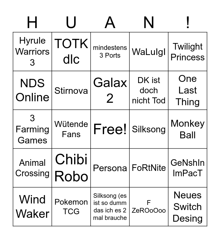 This bingo card has a free space and 24 words: Chibi Robo, Pokemon TCG, Galax 2, Wind Waker, Twilight Princess, Hyrule Warriors 3, NDS Online, TOTK dlc, Silksong, Persona, DK ist doch nicht Tod, 3 Farming Games, FoRtNite, GeNshIn ImPacT, Stirnova, F ZeROoOoo, Monkey Ball, mindestens 3 Ports, One Last Thing, Wütende Fans, Neues Switch Desing, Animal Crossing, WaLuIgI and Silksong (es ist so dumm das ich es 2 mal brauche.