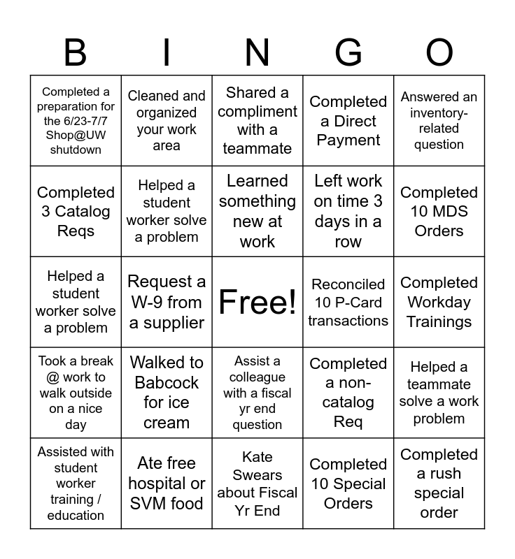 This bingo card has a free space and 29 words: Assisted with student worker training / education, Brought in a treat for the team, Request a W-9 from a supplier, Stopped to pet a UWVC patient, Completed a preparation for the 6/23-7/7 Shop@UW shutdown, Shared a compliment with a teammate, Helped a student worker solve a problem, Walked to Babcock for ice cream, Reconciled 10 P-Card transactions, Ate free hospital or SVM food, Completed Workday Trainings, Completed a rush special order, Kate Swears about Fiscal Yr End, Completed 10 Special Orders, Completed 10 MDS Orders, Kate aired grievances about how busy she is, Assist a colleague with a fiscal yr end question, Took a break @ work to walk outside on a nice day, Answered an inventory- related question, Helped a student worker solve a problem, Completed a non-catalog Req, Took an actual lunch break away from your desk, Left work on time 3 days in a row, Completed 3 Catalog Reqs, Completed a Direct Payment, Cleaned and organized your work area, Helped a teammate solve a work problem, Learned something new at work and Met a challenging work deadline.