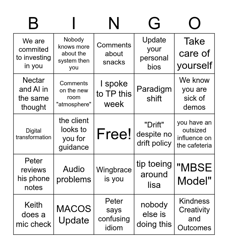 This bingo card has a free space and 26 words: Wingbrace is you, nobody else is doing this, I spoke to TP this week, MACOS Update, Take care of yourself, We are commited to investing in you, Nectar and AI in the same thought, Nobody knows more about the system then you, you have an outsized influence on the cafeteria, tip toeing around lisa, Paradigm shift, Digital transformation, "MBSE Model", Keith does a mic check, the client looks to you for guidance, Big things are coming, Update your personal bios, Peter reviews his phone notes, Comments about snacks, Kindness Creativity and Outcomes, We know you are sick of demos, Peter says confusing idiom, "Drift" despite no drift policy, Audio problems, Comments on the new room "atmosphere" and "motivated by food".