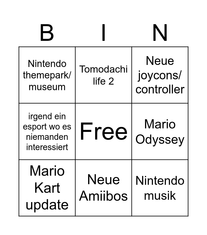 This bingo card has a free space and 8 words: Mario Odyssey, Neue joycons/ controller, Tomodachi life 2, Mario Kart update, Nintendo themepark/ museum, Nintendo musik, irgend ein esport wo es niemanden interessiert and Neue Amiibos.