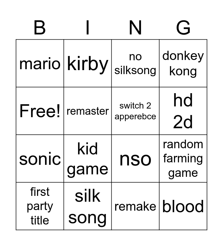 This bingo card has 16 words: silk song, random farming game, no silksong, mario, sonic, kirby, nso, remake, Free!, remaster, first party title, donkey kong, kid game, hd 2d, switch 2 apperebce and blood.
