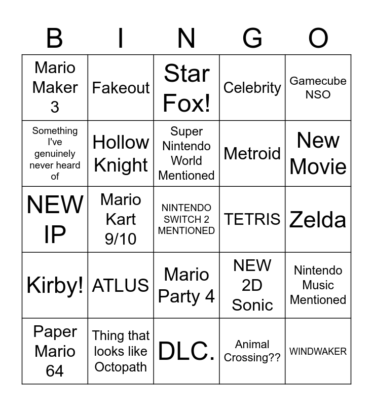 This bingo card has a free space and 29 words: Paper Mario 64, Splatoon 3 Extension / Third Kits, Mario Kart 9/10, NEW 3D Mario, Mario Maker 3, Star Fox!, Hollow Knight, ATLUS, TETRIS, Thing that looks like Octopath, Zelda, WINDWAKER, DLC., Animal Crossing??, New Movie, Punch-Out!!, Mario Party 4, Kirby!, Gamecube NSO, NEW IP, NEW 2D Sonic, Donkey Kong 64, Metroid, Something I've genuinely never heard of, Celebrity, Fakeout, Nintendo Music Mentioned, Super Nintendo World Mentioned and One Last Thing....