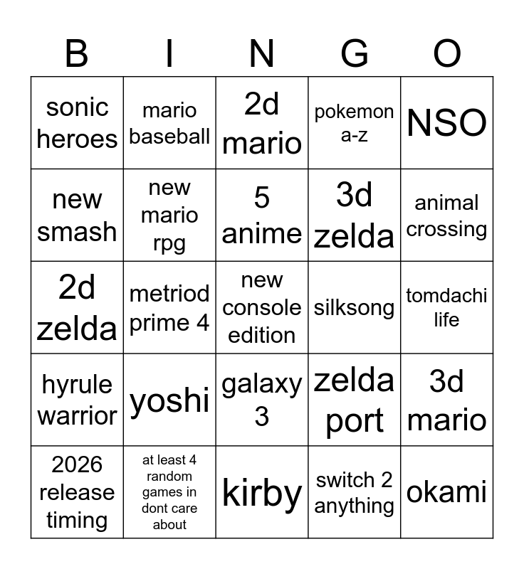 This bingo card has a free space and 24 words: yoshi, at least 4 random games in dont care about, 5 anime, 2026 release timing, NSO, sonic heroes, new smash, mario baseball, silksong, galaxy 3, 3d zelda, 2d zelda, zelda port, 3d mario, new mario rpg, switch 2 anything, tomdachi life, 2d mario, animal crossing, metriod prime 4, okami, hyrule warrior, pokemon a-z and kirby.