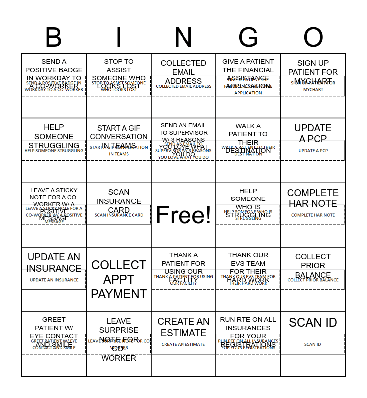 This bingo card has 23 images, a free space and 24 words: COLLECT APPT PAYMENT, LEAVE SURPRISE NOTE FOR CO-WORKER, SEND AN EMAIL TO SUPERVISOR W/ 3 REASONS YOU LOVE WHAT YOU DO, GREET PATIENT W/ EYE CONTACT AND SMILE, SIGN UP PATIENT FOR MYCHART, SEND A POSITIVE BADGE IN WORKDAY TO A CO-WORKER, HELP SOMEONE STRUGGLING, STOP TO ASSIST SOMEONE WHO LOOKS LOST, HELP SOMEONE WHO IS STRUGGLING, THANK A PATIENT FOR USING OUR FACILITY, WALK A PATIENT TO THEIR DESTINATION, LEAVE A STICKY NOTE FOR A CO-WORKER W/ A POSITIVE MESSAGE, THANK OUR EVS TEAM FOR THEIR HARD WORK, COLLECT PRIOR BALANCE, START A GIF CONVERSATION IN TEAMS, RUN RTE ON ALL INSURANCES FOR YOUR REGISTRATIONS, COMPLETE HAR NOTE, COLLECTED EMAIL ADDRESS, UPDATE A PCP, SCAN INSURANCE CARD, SCAN ID, UPDATE AN INSURANCE, GIVE A PATIENT THE FINANCIAL ASSISTANCE APPLICATION and CREATE AN ESTIMATE.