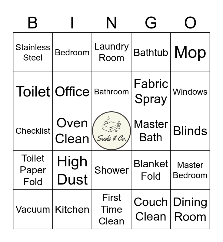 This bingo card has a free space and 24 words: High Dust, Kitchen, Bathroom, Vacuum, Mop, Stainless Steel, Toilet, Bedroom, Master Bath, Shower, Fabric Spray, Checklist, Blanket Fold, Master Bedroom, Office, Couch Clean, Blinds, Laundry Room, Windows, Oven Clean, Dining Room, Toilet Paper Fold, Bathtub and First Time Clean.
