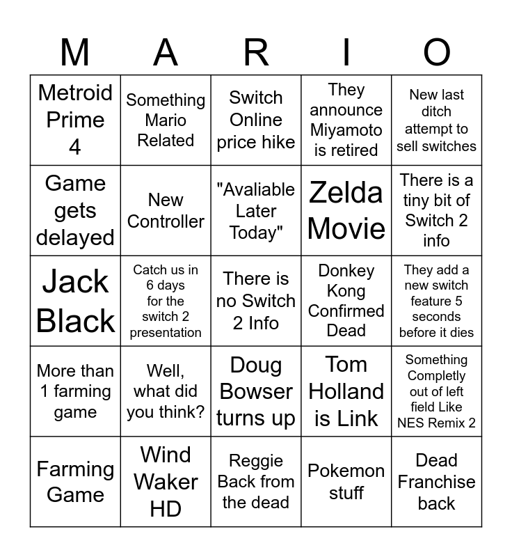 This bingo card has a free space and 24 words: Well, what did you think?, Wind Waker HD, "Avaliable Later Today", Farming Game, New last ditch attempt to sell switches, Metroid Prime 4, Game gets delayed, Something Mario Related, Donkey Kong Confirmed Dead, Doug Bowser turns up, Zelda Movie, Jack Black, Tom Holland is Link, Something Completly out of left field Like NES Remix 2, New Controller, Pokemon stuff, They add a new switch feature 5 seconds before it dies, Switch Online price hike, There is a tiny bit of Switch 2 info, Catch us in 6 days for the switch 2 presentation, Dead Franchise back, More than 1 farming game, They announce Miyamoto is retired and Reggie Back from the dead.