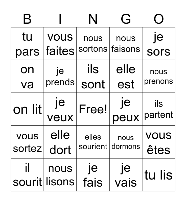 This bingo card has a free space and 29 words: il sourit, vous riez, je veux, il sort, tu pars, nous sortons, je prends, elle dort, je peux, nous lisons, ils partent, tu lis, je fais, je vais, nous prenons, tu ris, elles sourient, vous sortez, je sors, on lit, nous dormons, j'ai, elle est, on va, nous faisons, vous faites, vous êtes, ils sont and ils ont.