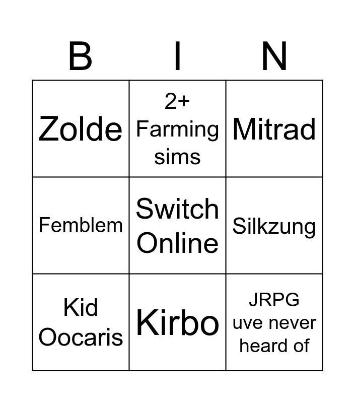 This bingo card has a free space and 8 words: Silkzung, Mitrad, 2+ Farming sims, Kid Oocaris, Zolde, JRPG uve never heard of, Femblem and Kirbo.