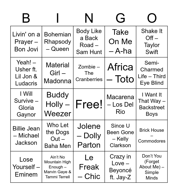 This bingo card has a free space and 54 words: Sweet Child O' Mine – Guns N' Roses, Billie Jean – Michael Jackson, Superstition – Stevie Wonder, Rapper’s Delight – The Sugarhill Gang, Jolene – Dolly Parton, Stayin’ Alive – Bee Gees, Take On Me – A-ha, Wannabe – Spice Girls, Yeah! – Usher ft. Lil Jon & Ludacris, Come on Eileen – Dexys Midnight Runners, Livin' on a Prayer – Bon Jovi, Like a Prayer – Madonna, Ain’t No Mountain High Enough – Marvin Gaye & Tammi Terrell, Lose Yourself – Eminem, Friends in Low Places – Garth Brooks, Le Freak – Chic, Don’t You (Forget About Me) – Simple Minds, Africa – Toto, Smells Like Teen Spirit – Nirvana, I Want It That Way – Backstreet Boys, Since U Been Gone – Kelly Clarkson, Poker Face – Lady Gaga, Macarena – Los Del Rio, Shake It Off – Taylor Swift, Hotel California – Eagles, Bohemian Rhapsody – Queen, Uptown Funk – Mark Ronson ft. Bruno Mars, Flowers – Miley Cyrus, No Scrubs – TLC, Crazy in Love – Beyoncé ft. Jay-Z, Blinding Lights – The Weeknd, Old Town Road – Lil Nas X, Sicko Mode – Travis Scott, Tennessee Whiskey – Chris Stapleton, Body Like a Back Road – Sam Hunt, Super Freak – Rick James, I Will Survive – Gloria Gaynor, Brick House – Commodores, Sweet Dreams (Are Made of This) – Eurythmics, Material Girl – Madonna, No Diggity – Blackstreet, MMMBop – Hanson, Mr. Brightside – The Killers, Somebody That I Used to Know – Gotye, Who Let the Dogs Out – Baha Men, California Love – 2Pac ft. Dr. Dre, Lose Control – Missy Elliott, Ms. Jackson – OutKast, Zombie – The Cranberries, Buddy Holly – Weezer, Semi-Charmed Life – Third Eye Blind, Plush – Stone Temple Pilots, Black Hole Sun – Soundgarden and Under the Bridge – Red Hot Chili Peppers.
