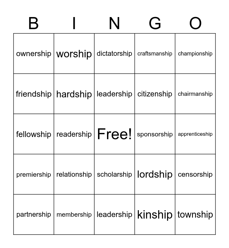 This bingo card has a free space and 24 words: relationship, membership, leadership, partnership, championship, ownership, friendship, worship, sponsorship, scholarship, citizenship, fellowship, lordship, censorship, hardship, kinship, apprenticeship, dictatorship, chairmanship, readership, township, premiership, craftsmanship and leadership.