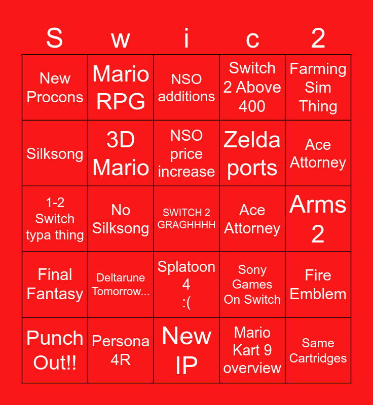 This bingo card has a free space and 24 words: Deltarune Tomorrow..., Persona 4R, NSO price increase, Punch Out!!, Farming Sim Thing, New Procons, Silksong, Mario RPG, Ace Attorney, Splatoon 4 :(, Zelda ports, 1-2 Switch typa thing, Sony Games On Switch, Fire Emblem, 3D Mario, Mario Kart 9 overview, Arms 2, NSO additions, Ace Attorney, No Silksong, Same Cartridges, Final Fantasy, Switch 2 Above 400 and New IP.