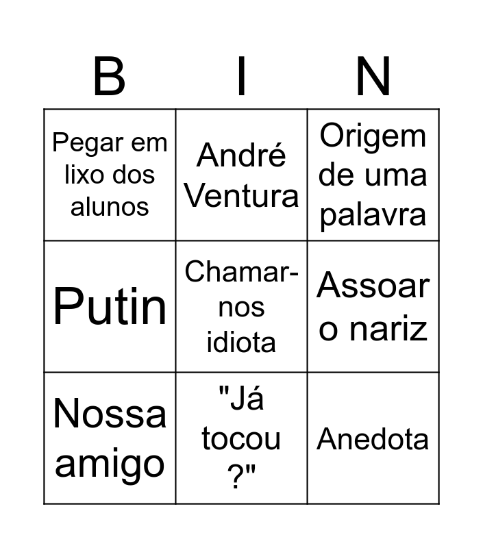 This bingo card has 60 words: Futebol, João Azevedo e/ou Diogo Vinhas, Origem de um Nome, Tirar uma quantidade do cu, Outra voz, "Diga, diga", Nossa amigo, Discurso conservador, Anedota, Suspiro profundo, Putin, Riso tímido, Assoar o nariz, Trotsky, Notícias / Pesquisas, Pegar em lixo dos alunos, "UAU", Chamar-nos idiota, Engenheiro, "Já tocou ?", Ad hoc, Origem de uma palavra, Email do Renato, Efetivamente, "Para o raio que o farta", Mutatis Mutandis, Mulheres, Bater nas mesas, Rir como um preto, "Coisa horrorosa", Lapsus scriptus, Salvo seja, Comentário sus, Interromper alguém a falar, André Ventura, FEs, Responder à própria pergunta, Reclama com o Leo, Elogiar a Vera ou a Maria, Usar o diminutivo, Ver as horas, Palavras / expressão desconhecida, Estalar os dedos, Droga, Na much, Criticar o atual governo, Não lembra ao macaco, Usar o Vítor ou o JP como exemplo, "Sou todo ouvidos", "Ó que caralho", Não marco falta, Storytime, Ipsis Verbis, Falar inglês, Tás-te a passar, Comentário sobre cabelo e/ou barba, Portóflios, Lafuente, Montenegro and Repetir um assunto já mencionado.