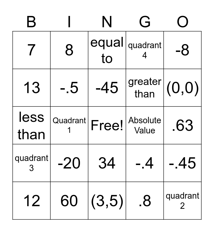 This bingo card has a free space and 24 words: -20, 60, -45, 12, -8, 7, 13, 8, Absolute Value, 34, greater than, less than, -.4, -.45, -.5, .8, .63, equal to, (0,0), Quadrant 1, quadrant 2, quadrant 3, quadrant 4 and (3,5).