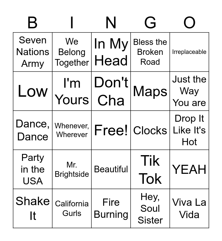 This bingo card has a free space and 67 words: Hey Ya, Bye Bye Bye, Toxic, YEAH, Single Ladies, Since U Been Gone, We Belong Together, I kissed a Girl, Don't Cha, Hips Don't Lie, Beautiful, Promiscuous, Drop It Like It's Hot, Irreplaceable, SexyBack, Low, Whenever, Wherever, Seven Nations Army, Feal Good Inc., Maps, Mr. Brightside, Party in the USA, Bless the Broken Road, Hey, Soul Sister, Chicken Fried, Hey There Delilah, Fireflies, Over My Head (Cable Car), Just the Way You are, This Love, Viva La Vida, Need You Now, Love Story, Dynamite, I Want it That Way, Shake It, Beautiful Girls, Tik Tok, Dance, Dance, Sugar, We're Going Down, Hero, I'm Yours, Clocks, Yellow, 1901, You Belong With Me, Use Somebody, California Gurls, Dirty Little Secret, Bad Day, In My Head, Magic, Unwritten, Pocketful of Sunshine, Love Song, Fire Burning, 7 Things, Brokenhearted, Before He Cheats, What Makes You Beautiful, Beautiful Soul, Burnin Up, 22, My Life Would Suck Without You, Sk8er Boi, Complicated and Raise Your Glass.