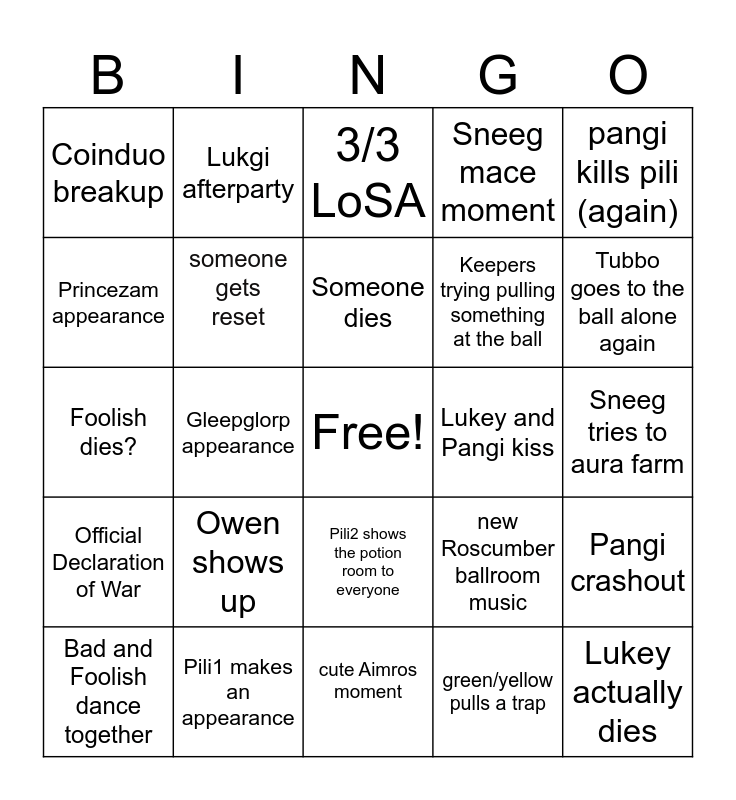 This bingo card has a free space and 24 words: Owen shows up, Pili1 makes an appearance, Someone dies, Bad and Foolish dance together, pangi kills pili (again), Coinduo breakup, Princezam appearance, Lukgi afterparty, Lukey and Pangi kiss, Pili2 shows the potion room to everyone, Keepers trying pulling something at the ball, Foolish dies?, new Roscumber ballroom music, Pangi crashout, someone gets reset, green/yellow pulls a trap, Sneeg tries to aura farm, 3/3 LoSA, Tubbo goes to the ball alone again, Gleepglorp appearance, Lukey actually dies, Official Declaration of War, Sneeg mace moment and cute Aimros moment.