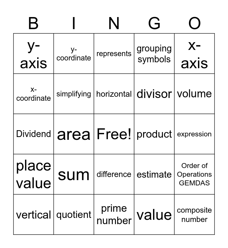 This bingo card has a free space and 24 words: sum, quotient, horizontal, vertical, x-axis, y- axis, x-coordinate, y- coordinate, product, difference, divisor, Dividend, estimate, Order of Operations GEMDAS, simplifying, value, expression, represents, volume, area, composite number, place value, grouping symbols and prime number.