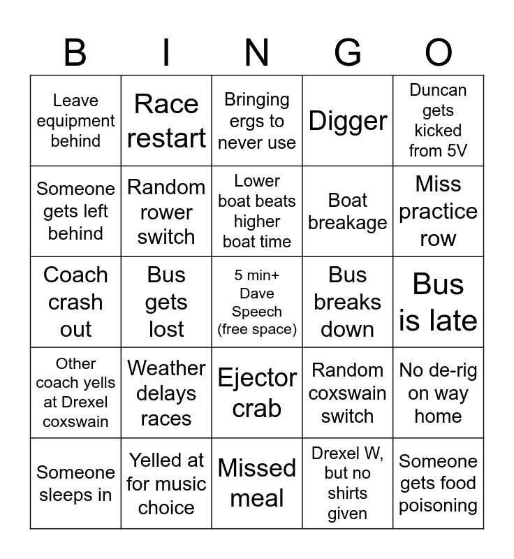 This bingo card has a free space and 24 words: Weather delays races, Yelled at for music choice, Lower boat beats higher boat time, Someone sleeps in, Duncan gets kicked from 5V, Leave equipment behind, Someone gets left behind, Race restart, Bus breaks down, Ejector crab, Boat breakage, Coach crash out, Random coxswain switch, No de-rig on way home, Random rower switch, Drexel W, but no shirts given, Bus is late, Bringing ergs to never use, Miss practice row, Bus gets lost, Someone gets food poisoning, Other coach yells at Drexel coxswain, Digger and Missed meal.