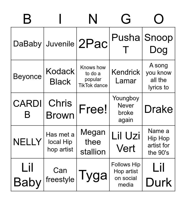 This bingo card has a free space and 24 words: Has met a local Hip hop artist, Can freestyle, Knows how to do a popular TikTok dance, Lil Baby, Snoop Dog, DaBaby, Beyonce, Juvenile, Youngboy Never broke again, Megan thee stallion, Kendrick Lamar, CARDI B, Lil Uzi Vert, Name a Hip Hop artist for the 90's, Kodack Black, Follows Hip Hop artist on social media, Drake, 2Pac, A song you know all the lyrics to, Chris Brown, Lil Durk, NELLY, Pusha T and Tyga.