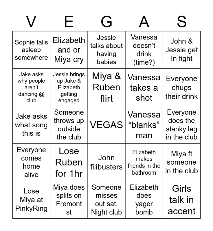This bingo card has a free space and 24 words: Lose Ruben for 1hr, Miya does splits on Fremont st, Miya & Ruben flirt, Lose Miya at PinkyRing, John & Jessie get In fight, Sophie falls asleep somewhere, Jake asks why people aren’t dancing @ club, Elizabeth and or Miya cry, Vanessa “blanks” man, John filibusters, Vanessa takes a shot, Jake asks what song this is, Elizabeth makes friends in the bathroom, Miya ft someone in the club, Jessie brings up Jake & Elizabeth getting engaged, Elizabeth does yager bomb, Everyone does the stanky leg in the club, Jessie talks about having babies, Everyone chugs their drink, Someone throws up outside the club, Girls talk in accent, Everyone comes home alive, Vanessa doesn’t drink (time?) and Someone misses out sat. Night club.
