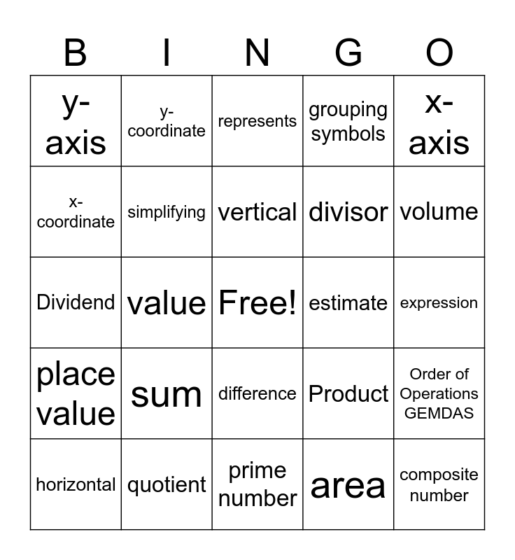 This bingo card has a free space and 24 words: sum, quotient, vertical, horizontal, x-axis, y- axis, x-coordinate, y- coordinate, estimate, difference, divisor, Dividend, Product, Order of Operations GEMDAS, simplifying, area, expression, represents, volume, value, composite number, place value, grouping symbols and prime number.