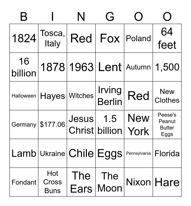This bingo card has 48 words: April 25, Halloween, 90 Million, New York, Red, Eggs, Tosca, Italy, 15,873 Pounds, 64 feet, Hot Cross Buns, 16 billion, Fox, $177.06, Germany, Hare, Chile, 1878, Hayes, Cuckoo, Poland, 1,500, Peese's Peanut Butter Eggs, 1824, 1963, Palm Sunday, Lent, Jesus Christ, 12, New Clothes, Irving Berlin, Easter Bonnets, Ukraine, Nixon, 27 hours, 1.5 billion, The Ears, The Moon, Witches, Fondant, Lily, Pennsylvania, Lamb, Red, Six Minutes, Autumn, Mardi Gras, Florida and Faberge.