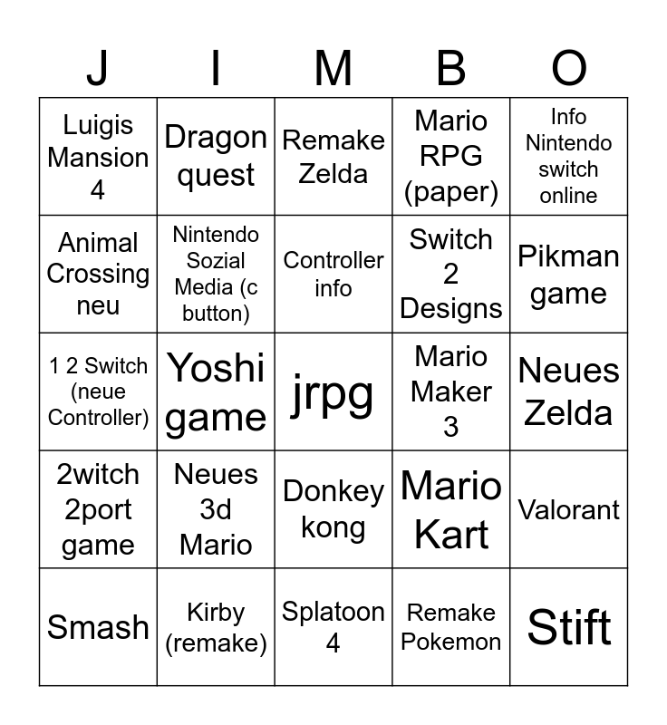 This bingo card has a free space and 24 words: Smash, Neues 3d Mario, Controller info, Remake Pokemon, Info Nintendo switch online, Luigis Mansion 4, Dragon quest, Remake Zelda, Mario Maker 3, Neues Zelda, 1 2 Switch (neue Controller), Nintendo Sozial Media (c button), Mario Kart, Valorant, Animal Crossing neu, Kirby (remake), Splatoon 4, Mario RPG (paper), Pikman game, 2witch 2port game, Yoshi game, Donkey kong, Switch 2 Designs and Stift.
