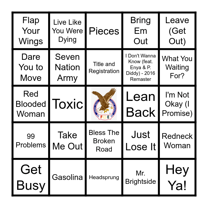 This bingo card has a free space and 54 words: 1, 2 Step (feat. Missy Elliott), 99 Problems, American Idiot, Are You Gonna Be My Girl, Bless The Broken Road, Breakaway, Bring Em Out, Come Clean, Dare You to Move, Drop It Like It's Hot, Flap Your Wings, Float On, Gasolina, Get Busy, Goodies (feat. Petey Pablo), Headsprung, Hey Ya!, I Don't Wanna Know (feat. Enya & P. Diddy) - 2016 Remaster, I Miss You, I'm Not Okay (I Promise), Just Lose It, La Tortura (feat. Alejandro Sanz), Lean Back, Leave (Get Out), Let's Get It Started, Live Like You Were Dying, Locked Up, Lose My Breath, Milkshake, Mr. Brightside, My Happy Ending, One Call Away, Only One, Pain, Pieces, Pieces Of Me, Red Blooded Woman, Redneck Woman, Save a Horse (Ride a Cowboy), Seven Nation Army, Slow Jamz, Sorry 2004, Staring at the Sun, Sunrise, Take Me Out, The Rat, The Reason, This Love, Title and Registration, Toxic, What You Waiting For?, With You, Yeah! (feat. Lil Jon & Ludacris) and You’ll Think Of Me.