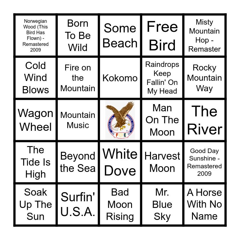 This bingo card has a free space and 51 words: (Sittin' On) the Dock of the Bay, A Horse With No Name, Autumn Leaves, Bad Moon Rising, Beyond the Sea, Big Yellow Taxi, Born To Be Wild, Call Of The Wild, Cold Wind Blows, Down by the River - 2009 Remaster, Fire on the Mountain, Free Bird, Good Day Sunshine - Remastered 2009, Harvest Moon, Hummingbird, Islands In The Stream, Kokomo, Man On The Moon, Man On The Silver Mountain, Misty Mountain Hop - Remaster, Mountain Music, Mr. Blue Sky, Norwegian Wood (This Bird Has Flown) - Remastered 2009, Raindrops Keep Fallin' On My Head, Redwood Tree, Rocky Mountain High, Rocky Mountain Way, Smoky Mountain Rain, Soak Up The Sun, Some Beach, Spring Affair, Summer Breeze, Sunshine, Sunshine On My Shoulders, Sunshine Superman, Surfin' U.S.A., Take Me to the River, Tall, Tall Trees, The Big Rock Candy Mountain, The Pine Tree, The River, The Tide Is High, The Trees, Three Little Birds, Thunder on the Mountain, Under the Boardwalk, Wagon Wheel, Walking On Sunshine, Welcome To The Jungle, White Dove and Wild World.