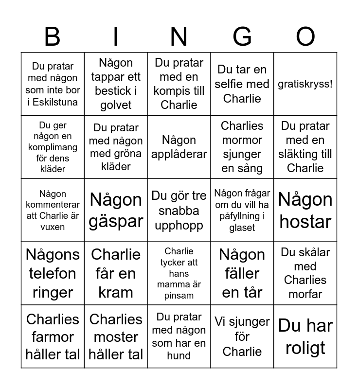 This bingo card has 30 words: Charlies moster håller tal, Någon säger att maten är god, Någon gäspar, Du pratar med någon som jobbar på kontor, Du pratar med någon som inte bor i Eskilstuna, Du pratar med en kompis till Charlie, Du pratar med någon med gröna kläder, Charlie tycker att hans mamma är pinsam, Någon frågar om du vill ha påfyllning i glaset, Du pratar med någon som har en hund, Någon hostar, Du gör tre snabba upphopp, Vi sjunger för Charlie, Du har roligt, Du pratar med en släkting till Charlie, Någon säger nåt random på engelska, Någon fäller en tår, Någons telefon ringer, Charlie får en kram, gratiskryss!, Någon kommenterar att Charlie är vuxen, Du utbringar en skål, Någon tappar ett bestick i golvet, Charlies mormor sjunger en sång, Du ger någon en komplimang för dens kläder, Du tar en selfie med Charlie, Du skålar med Charlies morfar, Charlies farmor håller tal, Någon applåderar and Du skålar med någon du inte känner.