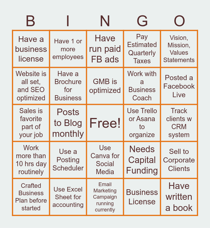 This bingo card has a free space and 24 words: Crafted Business Plan before started, Use a Posting Scheduler, GMB is optimized, Business License, Vision, Mission, Values Statements, Have a business license, Have 1 or more employees, Have run paid FB ads, Use Trello or Asana to organize, Track clients w CRM system, Sales is favorite part of your job, Have a Brochure for Business, Needs Capital Funding, Sell to Corporate Clients, Website is all set, and SEO optimized, Use Excel Sheet for accounting, Email Marketing Campaign running currently, Pay Estimated Quarterly Taxes, Posted a Facebook Live, Work more than 10 hrs day routinely, Posts to Blog monthly, Use Canva for Social Media, Work with a Business Coach and Have written a book.