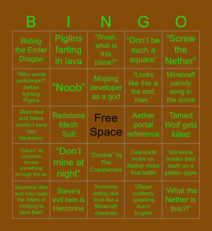 This bingo card has a free space and 39 words: Someone digging straight down and getting injured, “Uh, he’s right behind me, isn’t he?”, “I don’t think we’re in Kansas anymore” parody, “Noob”, Someone dies and they need the Totem of Undying to save them, “Zombie” by The Cranberries, Mojang developer as a god, Someone says “Boom!” after killing a Creeper, “Screw the Nether”, “Catch!” as someone throws something through the air, Redstone Mech Suit, “Don’t be such a square”, “What the Nether is this?!”, Tamed Wolf gets killed, Aether portal reference, “Don’t mine at night”, “You and what army?”, Riding the Ender Dragon, Using a command block as a superweapon, Overworld mobs vs. Nether mobs final battle, “Who wants porkchops?” before fighting Piglins, Someone eating real food like a Minecraft character, “Looks like this is the end, man.”, Minecraft parody song in the score, “Looks like this is the end of the mineshaft for you”, “Aw, man” after seeing a creeper, “Ow! Right in the cubes”, Eating during a serious scene, Falling asleep in the Nether/End, Piglins farting in lava, “See, they’re harmles-“, “I have a bad feeling about this…”, “Woah, what is this place?”, Steve’s evil twin is Herobrine, Villager suddenly speaking fluent English, “Let me teach you a few things about the Overworld. 1…”, Someone breaks their teeth on a golden apple, (Alex died and Steve couldn’t save her) backstory and “Here we do two things: Mine… and craft.”.