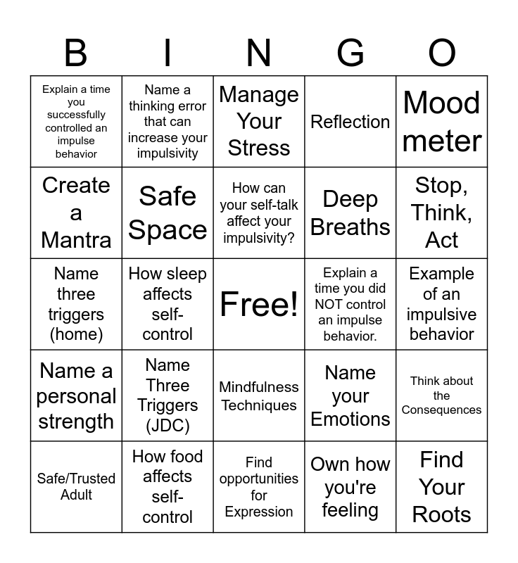 This bingo card has a free space and 29 words: Safe/Trusted Adult, Channel Your Feelings, How sleep affects self-control, Name 3 coping skills, Explain a time you successfully controlled an impulse behavior, Manage Your Stress, Safe Space, Name Three Triggers (JDC), Explain a time you did NOT control an impulse behavior., How food affects self-control, Example of an impulsive behavior, Find Your Roots, Find opportunities for Expression, Own how you're feeling, Stop, Think, Act, Know the source(s) of resentment, Mindfulness Techniques, Name a personal strength, Mood meter, Name three triggers (home), Name your Emotions, Name a Personal Strength, Deep Breaths, Create a Mantra, Reflection, Name a thinking error that can increase your impulsivity, Think about the Consequences, How can your self-talk affect your impulsivity? and Practice Delayed Gratification.