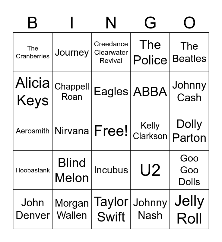 This bingo card has a free space and 29 words: John Denver, Billie Eilish, Nirvana, Red Hot Chili Peppers, The Cranberries, Creedance Clearwater Revival, Chappell Roan, Blind Melon, Kelly Clarkson, Morgan Wallen, Dolly Parton, Jelly Roll, Taylor Swift, Johnny Nash, Johnny Cash, Green Day, Incubus, Hoobastank, The Beatles, Aerosmith, U2, Joan Baez, ABBA, Alicia Keys, The Police, Journey, Goo Goo Dolls, Eagles and Billy Joel.
