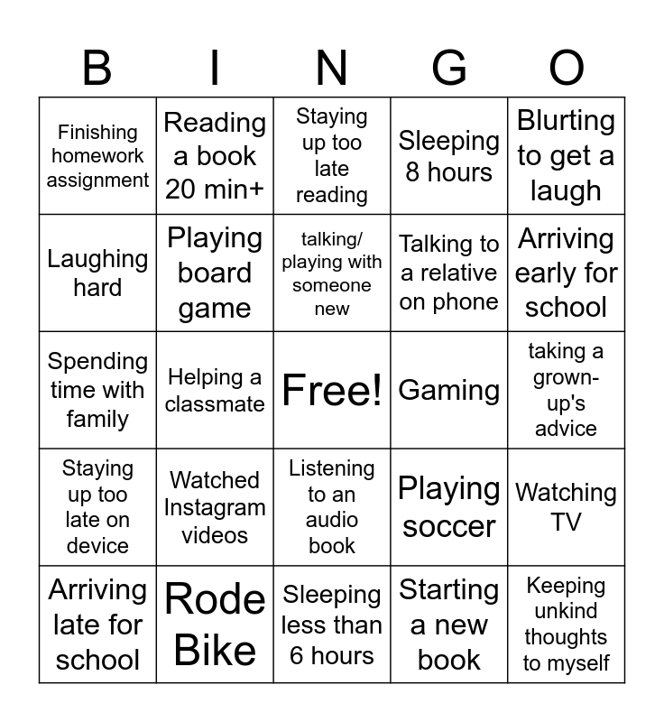 This bingo card has a free space and 24 words: Watched Instagram videos, Rode Bike, talking/ playing with someone new, Arriving late for school, Blurting to get a laugh, Finishing homework assignment, Laughing hard, Reading a book 20 min+, Gaming, Listening to an audio book, Talking to a relative on phone, Spending time with family, Playing soccer, Watching TV, Playing board game, Starting a new book, taking a grown-up's advice, Staying up too late reading, Arriving early for school, Helping a classmate, Keeping unkind thoughts to myself, Staying up too late on device, Sleeping 8 hours and Sleeping less than 6 hours.