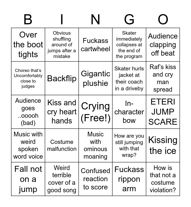 This bingo card has a free space and 29 words: Fall not on a jump, Nonsense gloves, Kiss and cry heart hands, Drastically wrong color tights, Over the boot tights, Fuckass cartwheel, Backflip, Costume malfunction, In-character bow, Weird terrible cover of a good song, ETERI JUMP SCARE, How is that not a costume violation?, Confused reaction to score, Fuckass rippon arm, Raf’s kiss and cry man spread, Spinning both ways, Music with ominous moaning, Music with weird spoken word voice, Audience clapping off beat, Audience goes ..ooooh (bad), How are you still jumping with that wrap?, Near collision on warmup, Skater hurls jacket at their coach in a driveby, Choreo that’s Uncomfortably close to judges, Skater immediately collapses at the end of the program, Obvious shuffling around of jumps after a mistake, Kissing the ice, Gigantic plushie and That’ll be a crotch shot in action pics.