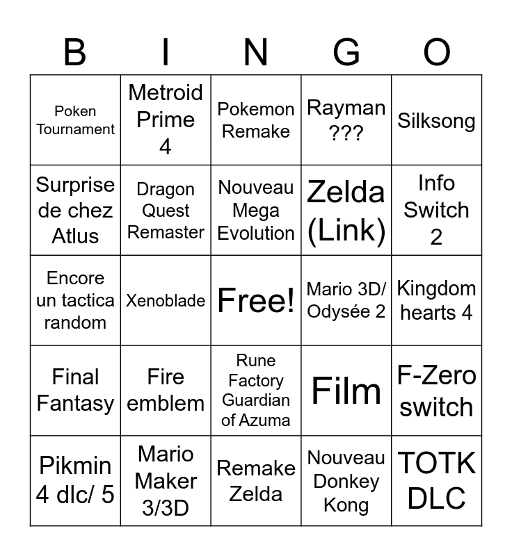 This bingo card has a free space and 24 words: Fire emblem, Mario Maker 3/3D, Nouveau Mega Evolution, Pikmin 4 dlc/ 5, Silksong, Poken Tournament, Surprise de chez Atlus, Metroid Prime 4, Mario 3D/ Odysée 2, Rune Factory Guardian of Azuma, Zelda (Link), Encore un tactica random, Film, F-Zero switch, Dragon Quest Remaster, Nouveau Donkey Kong, Kingdom hearts 4, Pokemon Remake, Info Switch 2, Xenoblade, TOTK DLC, Final Fantasy, Rayman ??? and Remake Zelda.