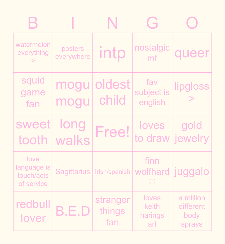This bingo card has a free space and 24 words: Sagittarius, B.E.D, oldest child, redbull lover, queer, watermelon everything >, squid game fan, posters everywhere, loves to draw, Irish/spanish, fav subject is english, sweet tooth, finn wolfhard ♡, juggalo, mogu mogu, loves keith harings art, gold jewelry, intp, lipgloss >, long walks, a million different body sprays, love language is touch/acts of service, nostalgic mf and stranger things fan.