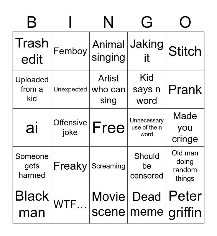 This bingo card has a free space and 24 words: Freaky, WTF…, Artist who can sing, Black man, Stitch, Trash edit, Uploaded from a kid, Femboy, Unnecessary use of the n word, Screaming, Kid says n word, ai, Should be censored, Old man doing random things, Unexpected, Dead meme, Made you cringe, Animal singing, Prank, Offensive joke, Peter griffin, Someone gets harmed, Jaking it and Movie scene.