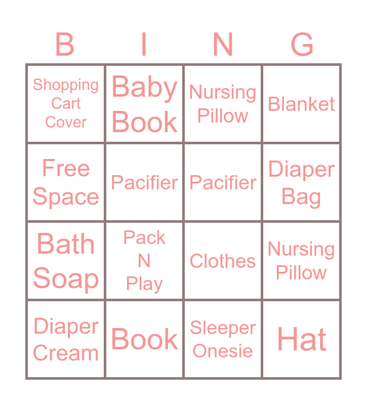 This bingo card has 36 words: Diapers, Wipes, Outfit, Pacifier, Socks, Hat, Diaper Bag, Bath Soap, Free Space, Burp Cloth, Nursing Pillow, Blanket, Brush, Book, Pack N Play, Shopping Cart Cover, Bow, Comb, Diaper Cream, Nursing Pillow, Sleeper Onesie, Diapers, Wipes, Swaddle, Stuffed Animal, Baby Book, Clothes, Hat/Bow, Bath Soap, Pacifier, Blanket, Toy, Socks, Bib, Brush/Comb and Diaper Bag.