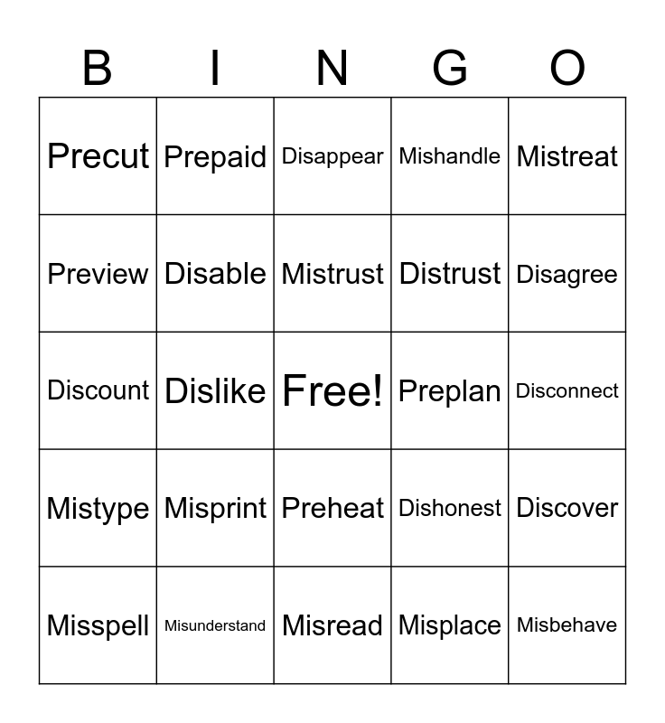 This bingo card has a free space and 25 words: Misprint, Misread, Mistrust, Misspell, Mistreat, Precut, Preview, Prepaid, Preplan, Preheat, Distrust, Discount, Dishonest, Discover, Disable, Prejudge, Disconnect, Disappear, Disagree, Dislike, Misbehave, Misunderstand, Mistype, Mishandle and Misplace.
