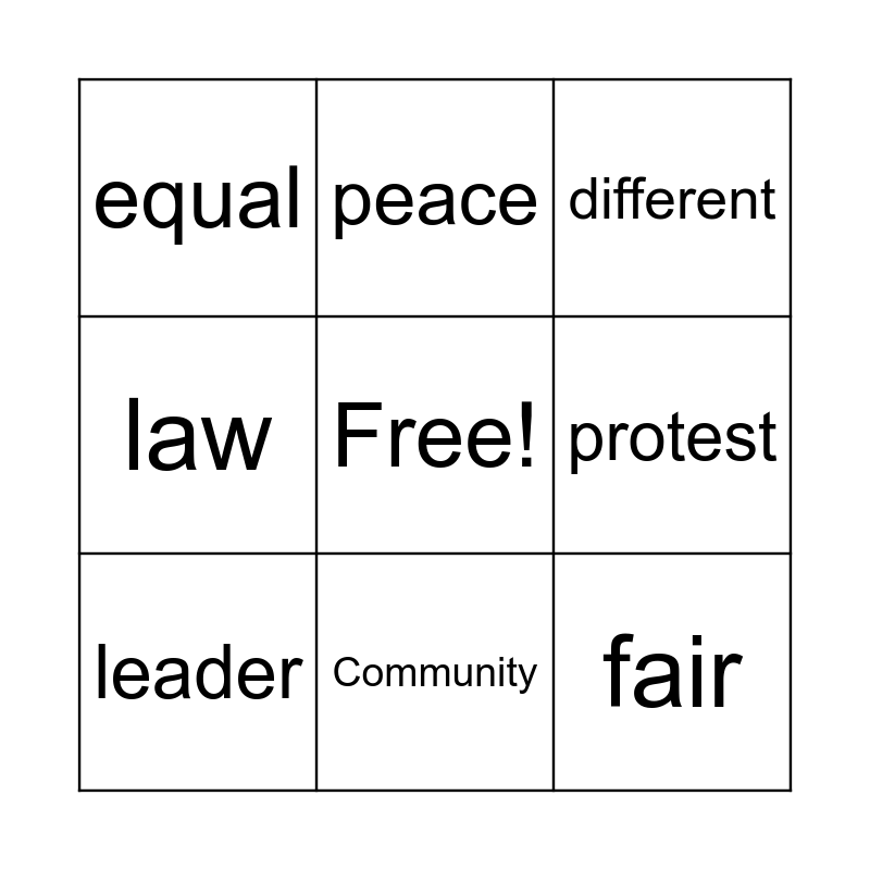 This bingo card has a free space and 10 words: Community, different, equal, fair, law, leader, peace, problem, protest and right.