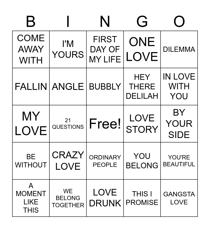 This bingo card has a free space and 24 words: CRAZY LOVE, WE BELONG TOGETHER, BUBBLY, A MOMENT LIKE THIS, DILEMMA, COME AWAY WITH, FALLIN, I'M YOURS, LOVE STORY, ORDINARY PEOPLE, HEY THERE DELILAH, MY LOVE, YOU BELONG, YOU'RE BEAUTIFUL, ANGLE, THIS I PROMISE, BY YOUR SIDE, FIRST DAY OF MY LIFE, IN LOVE WITH YOU, 21 QUESTIONS, GANGSTA LOVE, BE WITHOUT, ONE LOVE and LOVE DRUNK.