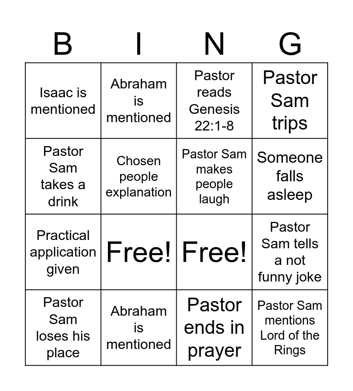 This bingo card has 16 words: Abraham is mentioned, Pastor Sam tells a not funny joke, Pastor reads Genesis 22:1-8, Isaac is mentioned, Practical application given, Abraham is mentioned, Free!, Pastor ends in prayer, Pastor Sam takes a drink, Chosen people explanation, Pastor Sam loses his place, Pastor Sam trips, Free!, Someone falls asleep, Pastor Sam makes people laugh and Pastor Sam mentions Lord of the Rings.