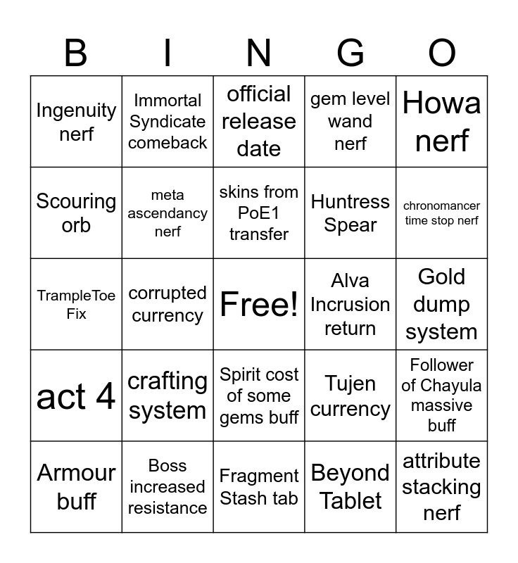 This bingo card has a free space and 25 words: crafting system, Fragment Stash tab, skins from PoE1 transfer, Armour buff, Howa nerf, Ingenuity nerf, Scouring orb, Immortal Syndicate comeback, Alva Incrusion return, Spirit cost of some gems buff, Huntress Spear, TrampleToe Fix, Tujen currency, Follower of Chayula massive buff, meta ascendancy nerf, Unique boss loot buff, Gold dump system, official release date, chronomancer time stop nerf, corrupted currency, attribute stacking nerf, Boss increased resistance, act 4, gem level wand nerf and Beyond Tablet.