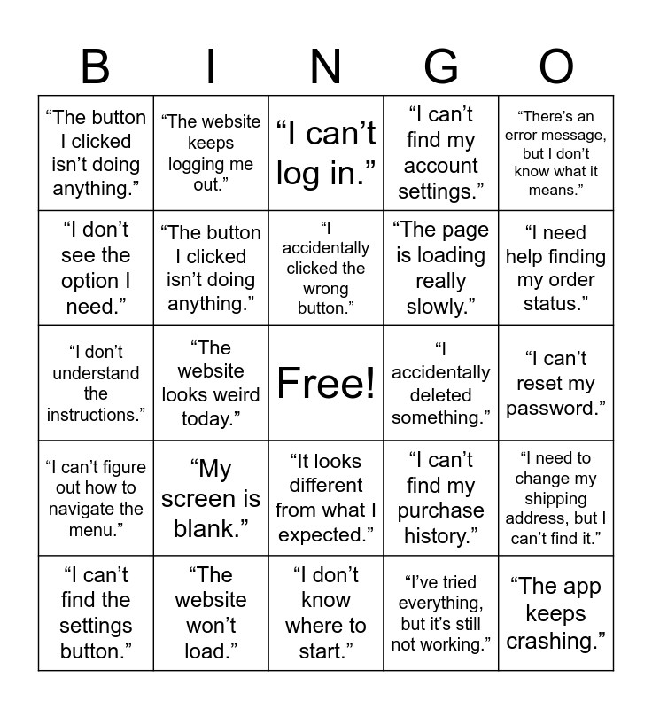 This bingo card has a free space and 29 words: “I can’t find the settings button.”, “My account keeps freezing.”, “The website looks weird today.”, “I don’t know why it isn’t working.”, “The button I clicked isn’t doing anything.”, “I can’t log in.”, “The button I clicked isn’t doing anything.”, “My screen is blank.”, “I accidentally deleted something.”, “The website won’t load.”, “I can’t reset my password.”, “The app keeps crashing.”, “I don’t know where to start.”, “I’ve tried everything, but it’s still not working.”, “I need help finding my order status.”, “I can't get my payment to go through.”, “It looks different from what I expected.”, “I can’t figure out how to navigate the menu.”, “There’s an error message, but I don’t know what it means.”, “I don’t understand the instructions.”, “I can’t find my purchase history.”, “My cart is empty, even though I added things.”, “The page is loading really slowly.”, “I don’t see the option I need.”, “I can’t find my account settings.”, “The website keeps logging me out.”, “I need to change my shipping address, but I can’t find it.”, “I accidentally clicked the wrong button.” and “The link is broken.”.