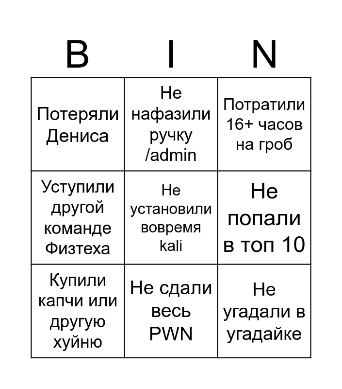This bingo card has a free space and 8 words: Не попали в топ 10, Потратили 16+ часов на гроб, Не нафазили ручку /admin, Купили капчи или другую хуйню, Потеряли Дениса, Не угадали в угадайке, Уступили другой команде Физтеха and Не сдали весь PWN.